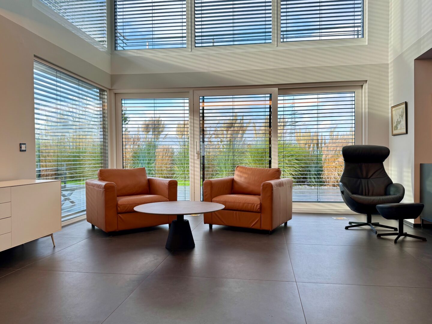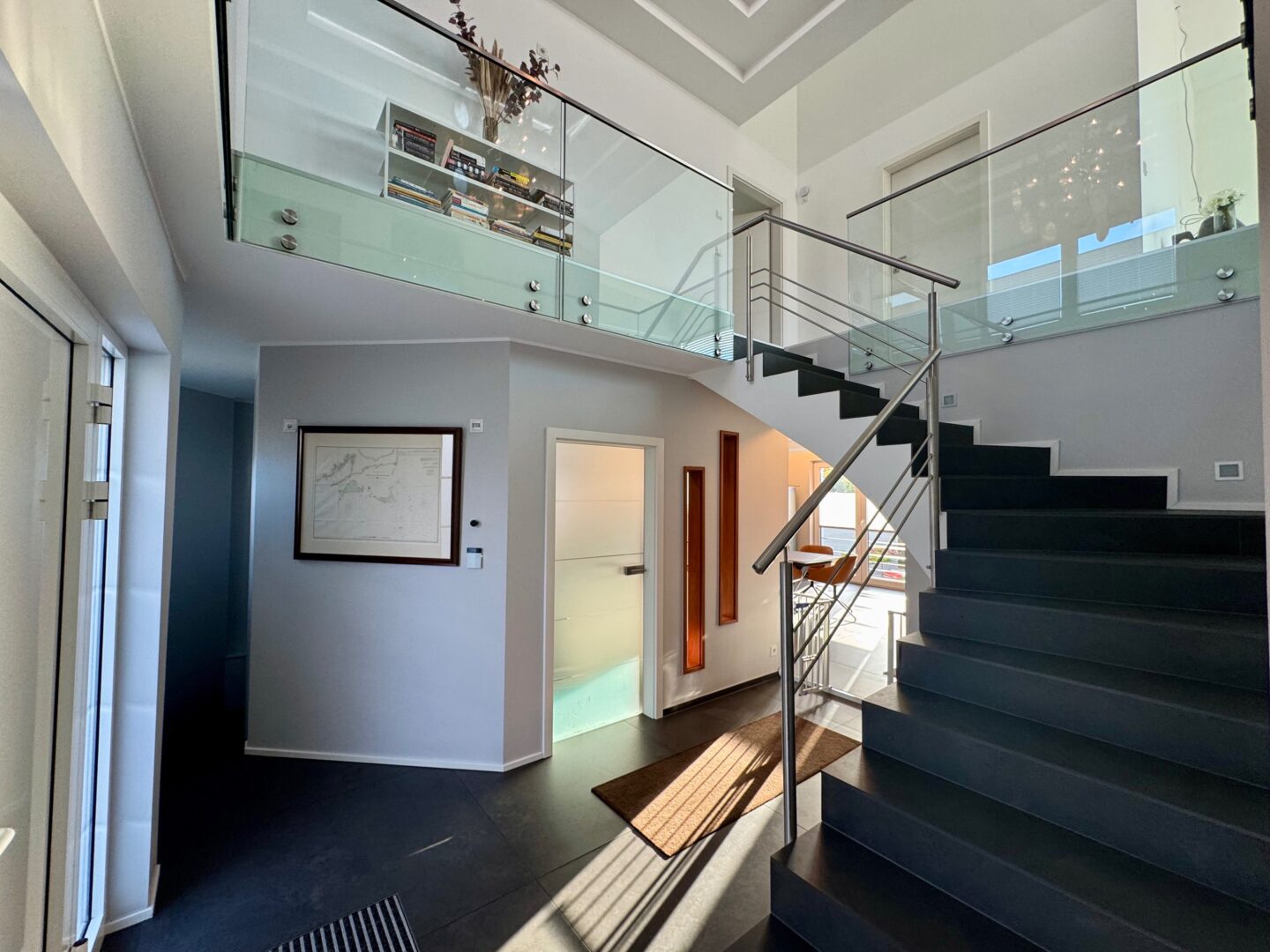 Im Erdgeschoss überzeugt der offene Wohnstil mit einer großzügigen Diele, einem hellen Wohn- und Essbereich mit direktem Zugang zur Terrasse sowie einer hochwertigen Küche mit Miele-Geräten und amerikanischer Kühl-Gefrierkombination. Große Fensterflächen schaffen eine lichtdurchflutete Atmosphäre und eine fließende Verbindung zwischen Innen- und Außenbereich. Ein Gäste-WC ergänzt die Etage.